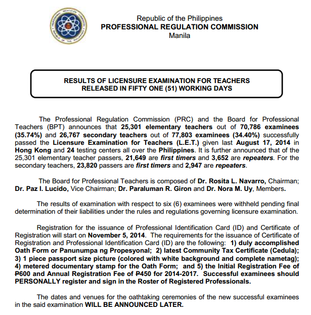 Meanwhile, the Board of Professional Teachers comprises Dr. Rosita Navarro, Chairman; Dr. Paz Lucido, Dr. Paraluman Giron, and Dr. Nora Uy as the members legally constructed the LET Test which was then held last August 17 in different part of the Philippines.