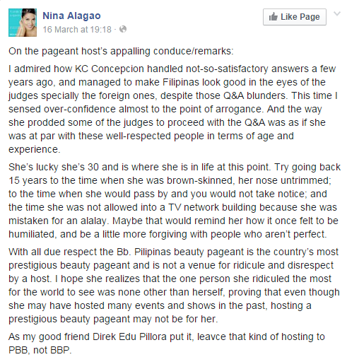 One in particular who openly spoke against it was former beauty queen, Nina Ricci-Alagao. Through her Facebook post, she called out Toni Gonzaga as being overly confident and her attitude was humiliating for both the candidates and judges.